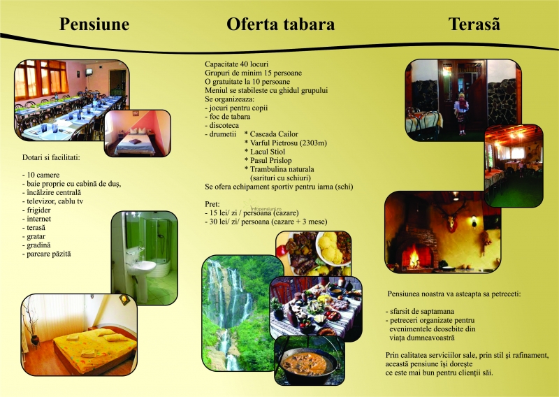 Pensiunea noastra va pune la dispozitie 10 camere cu o capacitatea de 40 de locuri ,baie proprie in camera cu cabina de dus, sala de mese, terasa, gratar, loc de joaca, parcare.